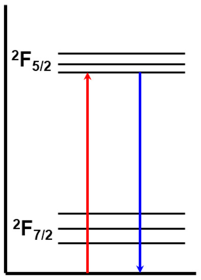 The structure of the Stark levels of the 2F7/2 and 2F5/2 multiplets of Yb3+ ions is shown in Figure 6. The red arrow corresponds to the transition between the lower Stark level of the 2F7/2 multiplet and the lower Stark level of the 2F5/2 multiplet of Yb3+ ions. The blue arrow corresponds to the transition between the lower Stark level of the 2F5/2 multiplet and the lower Stark level of the 2F7/2 multiplet of Yb3+ ions.