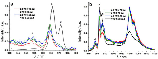Previously, the spectral-luminescent properties of crystals of yttrium-stabilized zirconium dioxide doped with Yb3+ ions were studied in [26]. The authors of this work discriminate in the spectra of crystals of cubic stabilized zirconia doped with Yb3+ ions, characteristic lines in the absorption and luminescence spectra, designated by them as A, B, and C, due to transitions between the lower Stark levels of the 2F7/2 and 2F5/2 multiplets of Yb3+ ions (Figure 6). Line A corresponds to Yb3+ ions occupying positions in the center of the oxygen eight-vertex. Line B corresponds to Yb3+ ions located in the center of an eight-vertex structure and having a vacancy in the second coordination sphere. Line C belong to Yb3+ ions occupying positions in the center of the seven-vertex formed by oxygen ions.