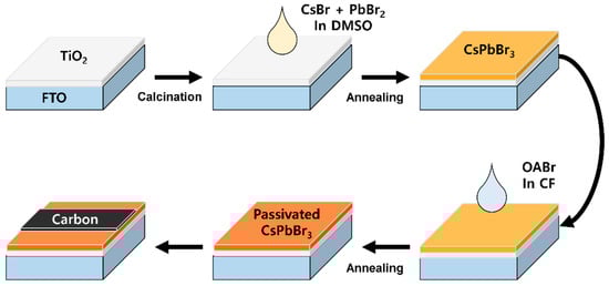In this work, CsPbBr3 PPVs were fabricated with the device structure of FTO/TiO2/CsPbBr3/carbon electrode, as shown in Figure 1. The surface treatment of CsPbBr3 perovskite layer was performed by depositing OABr solution in CF on the top surface of CsPbBr3 layer and consecutive annealing process. No significant variation of morphologies of CsPbBr3 films before and after surface treatment were identified by measuring SEM (Figure S1). Thus, the morphological effects were excluded when comparing the device performances of PPVs with and without surface treatment [,].