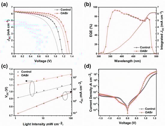 The effects of OABr surface treatment on the performances of CsPbBr3 PPVs were investigated by measuring J–V curves under AM 1.5 G illumination, as shown in Figure 2a and Table 1. Control CsPbBr3 PPV showed a PCE of 4.57% with an VOC of 1.17 V, a short-circuit current density (JSC) of 6.33 mA cm−2 and a fill factor (FF) of 61.7%. After introducing the surface treatment using OABr, the CsPbBr3 PPV provided an improved PCE of 5.63% with a VOC of 1.34 V, a JSC of 6.35 mA cm−2 and an FF of 66.2%. Then, the energy losses (Eloss) of CsPbBr3 PPVs were obtained from the difference between VOC from J–V characteristics and optical bandgap (2.31 eV) of CsPbBr3 from UV–Vis optical spectra []. The calculated Eloss values were 1.14 eV for the control device and 0.97 eV for the OABr-treated device. Since the OABr surface treatment did not lead to the shift of the absorbance edge of the CsPbBr3 films, as shown in Figure S2, the suppression of Eloss in OABr-treated PPV would imply that OABr surface treatment contributes to the reduced trap density. Additional possible reason for the reduced Eloss of PPVs after OABr treatment is the low dipole moment arising from the long alkyl chains, leading to the facilitated charge transfer at perovskite/carbon electrode interface in the PPV by inducing the better energy alignment [,,,,].