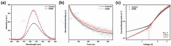 To gain deeper insight on the trap passivation of OABr on the CsPbBr3 films, steady-state and time-resolved PL analyses were carried out. As shown in Figure 3a, the increased intensity and blue shift were observed in the emission peak of steady-state PL spectra after the top surface of the CsPbBr3 film was treated with OABr []. The enhanced PL intensity referred to the suppression of non-radiative recombination [], and the blue shift of PL peak possibly indicated the reduced trap density of the CsPbBr3 film by the interaction between CsPbBr3 and OABr after surface treatment [].
