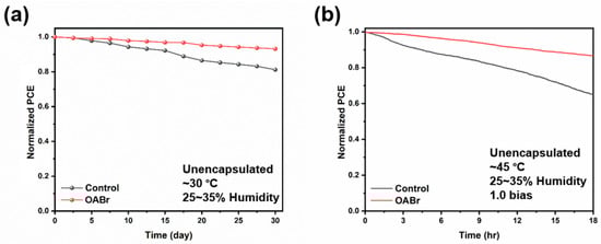 The long-term stabilities of CsPbBr3 PPVs were tested under ambient condition (~30 °C temperature and 25~35% relative humidity) without any encapsulation. As shown in Figure 4a, the control CsPbBr3 PPV without surface treatment showed a faster decay of photovoltaic performance and provided 80% of its initial PCE after storage test. However, the OABr-treated PPV showed an enhanced shelf-lifetime and retained 90% of its original PCE after 30 days of storage. The lengthened storage lifetime of the OABr-treated PPV would have originated from the hydrophobicity of long alky-chains from OABr [] and reduced interfacial traps in PPVs. Additionally, maximum power point tracking of PPVs under 1-sun illumination were studied under a temperature of ~45 °C and constant bias of 1.0 V, as shown in Figure 4b. The OABr-treated CsPbBr3 PPVs preserved ~90% of initial power output after 18 h, while the control device showed ~70% of initial value. These stability results show the passivating CsPbBr3 films through OABr surface treatment is beneficial for preserving the device performance of PPVs.