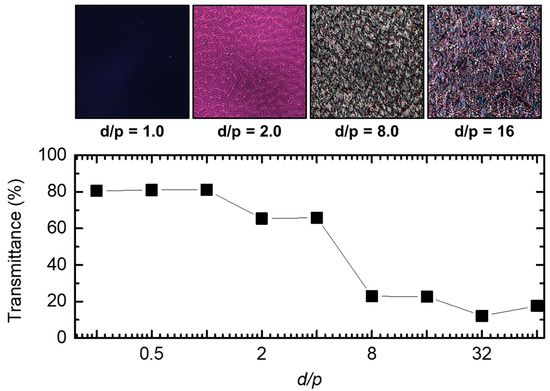 To fabricate a ChLC cell in the ULH state, it is necessary to align the helical axis of the ChLCs parallel to the substrate. Uniform homeotropic alignment can support the configuration in which the helical axis is parallel to the substrates. However, if the chiral dopant is not sufficient, the ChLCs cannot maintain the chiral state. The minimal helical pitch length pth for the homeotropic state can be expressed as pth = 2dk2/k3 [24,25,26,27,28], where d is the cell gap, and K2 and K3 are the twist and bend elastic constants, respectively. If the pitch length is longer than the pth, the chiral torque is too weak. Therefore, the LCs are unable to twist, and the LC cell shows the homeotropic alignment of LCs. When the pitch length is shorter than pth, the chiral torque is sufficiently strong. Therefore, the various chiral structures, such as fingerprint state and focal-conic state, can be observed. Figure 1 depicts the transmittance and POM images of LC cells with the homeotropic anchorings as functions of the d/p. The transmittance was measured as the ratio of the incident light intensity and the transmitted light without polarizers. The transmittance of the LC cell decreased with the increase in d/p because of the light scattering in the fabricated LC cell. To utilize a stable ULH state with homeotropic anchoring, we set the pitches of ChLCs as d/p = 2 for which the cell is in the fingerprint state.