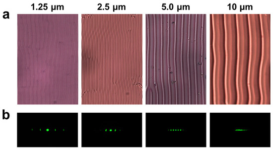 The obtained ULH textures were visually captured by observation of the sample using a polarized optical microscope (POM). As shown in Figure 2a, POM images of the fabricated cell showed well-formed periodic structures with the pitches as designed. The measured grating periods Λ of the ULH cells were 2.5, 5, 10, and 20 μm, which are twice the cholesteric pitches, respectively, because the helix could be distorted by confining ChLCs between the two substrates coated to produce homeotropic boundary conditions [25]. To further the dependence of a ULH grating on the grating period Λ, polarized light from the green laser is normally incident to the cell. The diffraction pattern was captured with a digital camera. As shown in Figure 2b, it was confirmed that the smaller the grating period, the narrower the interval between each pattern.