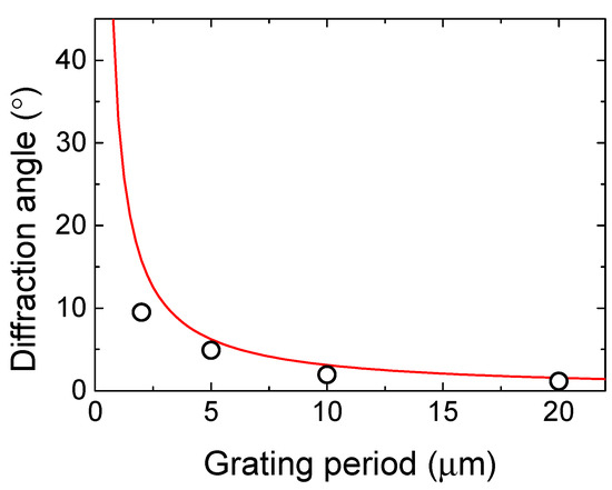 where λ and Λ are the wavelengths of the probe beam and grating period of the diffraction grating element, respectively [30]. The calculated diffraction angles show good agreement with the measured results, as shown in Figure 3.