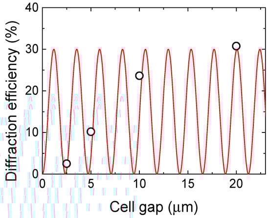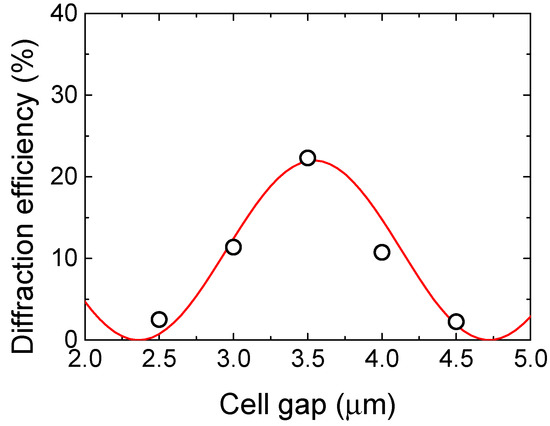 Figure 4 shows the change in first-order diffraction efficiency as a function of the cell gap. The diffraction efficiency is proportional to the square of a sinusoidal function with a period of (π∆nd)/(λcosβ), where λ and β are the wavelength and the incident angle of the probe beam, respectively; d is the thickness of the liquid crystal layer; ∆n is the refractive index difference in the grating [31]. As shown in Figure 1, the measured results (dots) show the same periodicity with the proportional expression.