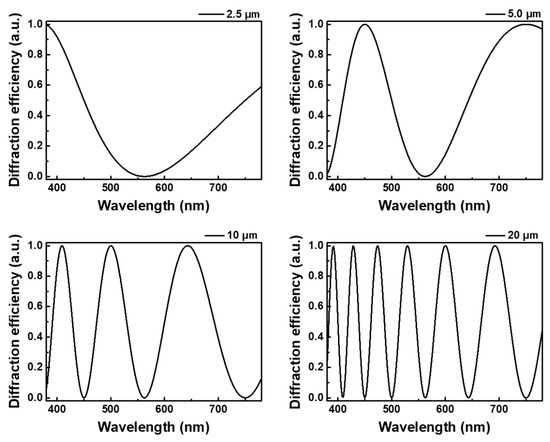 The diffraction efficiency of the ULH cells as a function of the wavelength of incident light with the cell gap of 2.5, 5, 10, and 20 μm. The pitch of ChLCs were set as half of the cell gap.