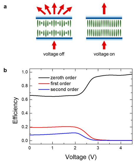The fabricated ULH cell is switchable by merely applying a voltage wave. Figure 7a shows the schematic operation of the fabricated ULH cell. Initially, the incident light is diffracted by the ULH texture. When a vertical electric field is applied to the cell, the LC molecules are reoriented along the vertical direction. Therefore, the light passes through the cell with no diffraction. Figure 7b shows the measured diffraction efficiency for each order ηm = Im/I0 as the applied voltage is increased. Initially, the diffraction efficiency of the zeroth-, first-, and second-order was 66.1%, 19.5%, and 8.4%, respectively. As expected, the increase in the applied voltage led to increased zeroth-order efficiency and a decrease in other orders. When the applied voltage was over 3 V, the diffraction efficiency of the zeroth-order became 93.7%. The fabricated ULH cell can be switched at a low operating voltage of 3 V.