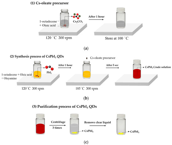 The experiment modified the hot-injection method reported by Chenghao Bi et al. [16]. All the experiments were performed in a glove box filled with nitrogen, H2O < 1 ppm and O2 < 1 ppm. The schematic diagram of the experiment is shown in Figure 1.