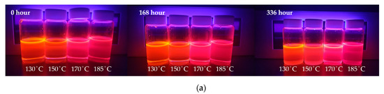 (a) Colloidal solutions at different synthesis temperatures in toluene under UV lamp (λ = 365 nm). (b) CsPbI3-QD (0 h) at different synthesis temperatures.