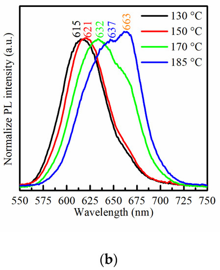 Figure 2a shows the CsPbI3 quantum dots under UV lamp irradiation. We used different temperatures to synthesize orange wavelength to red wavelength of quantum dots in the glove box and stored QDs in the atmosphere for two weeks. It can be observed that the luminescence properties of the four bottles of quantum dots have not changed a lot, which also represents that we can prepare stable perovskite quantum dots. Figure 2b shows the PL images of CsPbI3 quantum dots at different synthesis temperatures. Due to the quantum confinement effect, as the synthesis temperature increases, the energy level of the quantum dots becomes smaller and causes the emission peak to red shift. We found an unknown emission peak at 663 nm. The intensity of the peak will be enhanced with the increasing of the synthesis temperature. The information of the new peak is not known yet, but it may be due to thermal effects, which are caused by the increasing of the synthesis temperature, and it makes the new emission peak at a long wavelength.