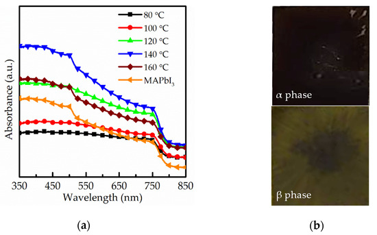 Figure 3 shows the absorption spectrum for QDs doped perovskite thin films. It reveals two peaks of 750 nm and 500 nm that are conjectured due to the α phase and β phase. The annealing temperature was increased from 80 °C to 160 °C, and it is found that the absorption area increased in the entire spectral range (350–850 nm). Then, the absorption area does not increase infinitely with the annealing temperature rising. When the annealing temperature is up to 160 °C, a few yellow spots appear on the surface of the film, as shown in Figure 3b. The morphology of the perovskite yellow phase named β phase will reduce the performance of absorption, resulting in a slight decrease in the absorption area. Compared with pure MAPbI3, the absorption of long-wavelength is improved after the all-inorganic perovskite quantum dots are incorporated. This is due to the fact that the energy gap of CsPbI3 QDs is wider and the small strain occurs at the quantum dot-MAPbI3 interface [17,18]. For short wavelengths, when the annealing temperature is at 80–120 °C, the energy provided by the annealing treatment is not enough to convert precursors such as MAI and PbI2 into perovskite, so the typical absorption peak (500 nm) of perovskite cannot be observed. Thus, most unconverted precursors will affect the absorption capacity of the QDs doped perovskite thin films.