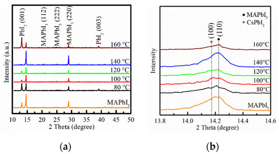 For the CsPbI3-QDs doped perovskite thin films, we discuss its crystal phase. Figure 4a shows the X-ray Diffraction patterns of CsPbI3-QDs doped perovskite thin films. In Figure 4a, it is observed that when the annealing temperature increases, the peak position does not change significantly, and the two strong peaks are observed around 14° and 28°. With the increasing of annealing temperature, the peak position of PbI2 (001) at 13.7° gradually decreases and it vanishes at 140 °C; we know that PbI2 is the precursor of MAPbI3 and CsPbI3. The amount of this compound will affect the efficiency of CsPbI3-QDs doped perovskite thin films as a perovskite solar cell. It can be inferred from the above XRD pattern that 140 °C is indeed the optimal annealing temperature for CsPbI3-QDs doped perovskite thin films. From the literature, it is well known that the peaks of MAPbI3 and CsPbI3 are very close [19,20], so we zoom in the peaks near 14° and 28°, as shown in Figure 4b. It can be found that when the annealing temperature increases, the shape of the peak is no longer symmetrical, and additional peaks appear. It seems this extra peak is the preferred peak of CsPbI3. Therefore, it is necessary that the peak is fitted.