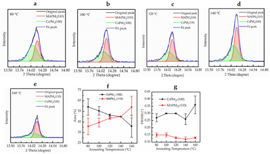 Figure 5 shows the XRD peak fitting patterns of various annealing temperatures and their area, Full width at half maximum (FWHM). From Figure 5a–e, as the annealing temperature increases, the area occupied by MAPbI3 gradually increases, while the peak area occupied by CsPbI3 gradually decreases, until the area reaches 50% when it reaches 140 °C. We concluded that when the peak area ratio of CsPbI3/MAPbI3 is closer to 1, it is most suitable for perovskite crystallization. Meanwhile, the FWHM of MAPbI3 and CsPbI3 is the smallest, which means that the crystallinity of the perovskite is uniform. To perform further evaluation of crystal quality, we also calculated the crystallite size (D) by using Scherrer’s formula [21]: