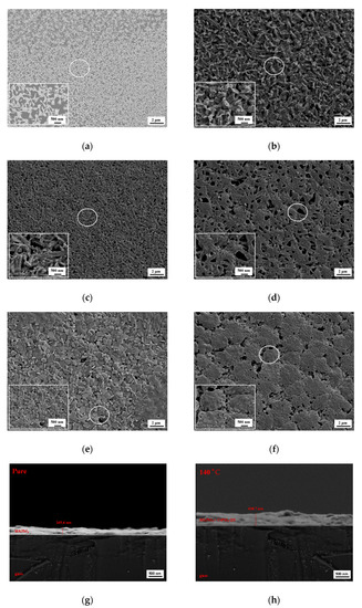 Figure 6a–f shows the SEM top view of pure MAPbI3 and CsPbI3-QDs doped perovskite thin films at different annealing temperatures. The surface morphology (grain size and shape) of the CsPbI3-QDs doped perovskite thin film changes significantly with the increasing of the annealing temperature. When the annealing temperature is 80 °C to 120 °C, it can be observed that the whole thin films are not dense from Figure 6a–c. These areas uncovered by perovskite will reduce the efficiency of the solar cell because the uncovered part will become an electron trap and make electron-hole recombination around the grain boundary. However, when the annealing temperature increases to 140 °C, the thin film is evenly covered by the perovskite, which will greatly improve the performance of the device, but when the annealing temperature is up to 160 °C, the voids around the perovskite are formed again, resulting in the performance of the device being worse. To further understand the changes in the morphology around the grain boundary, we zoom in the scale to 500 nm, as shown in inset images. When the annealing temperature is 80 °C to 120 °C, both the typical morphology of perovskite and the precursors (MAI, PbI2) can be formed at the same time. Then, a small amount of precursors can be used as an electron blocking layer [22], but excess precursors will lead to dendritic structure and void, causing in the surface of the perovskite film to become rough and to reduce the efficiency of the device. When the annealing temperature is up to 140 °C, the morphology of the perovskite is vastly changed, the original dendrite structure is transformed to a tetragonal structure and the void is also significantly decreased. In inset image of Figure 6f, the large size of the tetragonal structure is formed by a cluster of small perovskite crystallites. The precursor PbI2 surrounds the grain boundary, which makes the surface of the perovskite thin film become rough at 160 °C. Figure 6g–h shows the cross-sectional SEM images. During the experiment, all parameters remained the same except for the composition of the solution doping CsPbI3 QD. The reason for the larger thickness of Figure 6h may be due to the increase of the film formation rate and the increase of the grain size when the Cs ions in the CsPbI3 are introduced into the perovskite thin film [12].