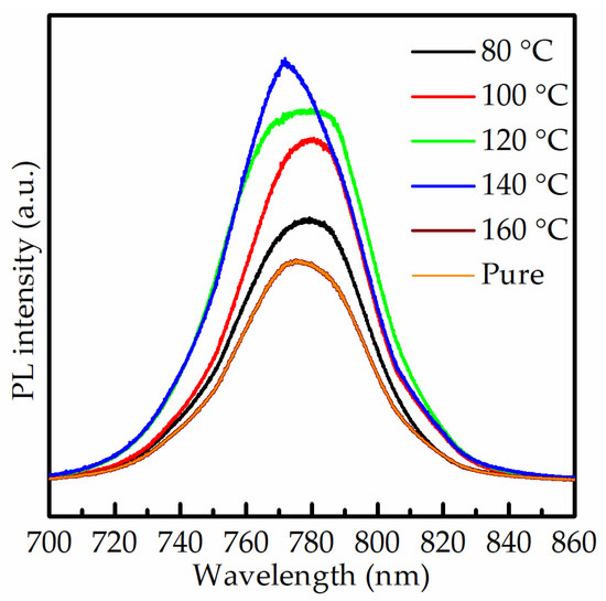 Figure 7 shows the PL spectrum of QD doped perovskite thin films under different annealing temperatures in N2 ambient and pure perovskite. The PL intensity of the perovskite film with doping QD was drastically enhanced compared to that of pure film. It is attributed to the improved crystallinity and larger grain sizes that are consistent with the result of the SEM in Figure 6. When the annealing temperature is up to 140 °C, we observed a slight blue shift and broader peak, which may be caused by the doping CsPbI3-QDs with the wider energy band gap.