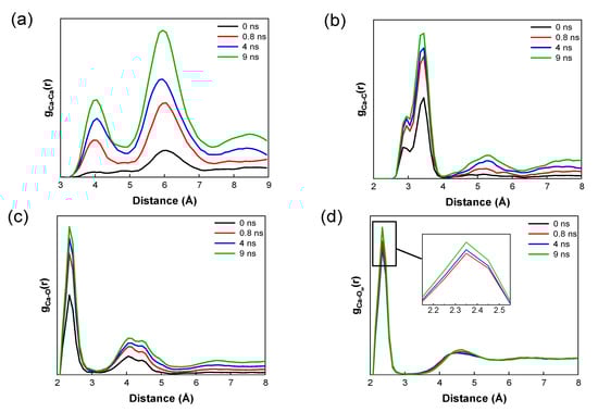 The Ca-Ow coordination number represents the hydration number. There is no obvious peak near 4 Å at 0 ns, while the peak near 6 Å is observed as presented in Figure 1a suggesting that two calcium ions coordinated with each other are mainly paired with different oxygens of a carbonate [32]. Peaks in RDFs of Ca-Ca, Ca-C, and Ca-O increase during PNCs growth and aggregation, while they slightly decrease for Ca-Ow as shown in Figure 1a–d. These variations display the trend for the combining of Ca2+ and CO32−.