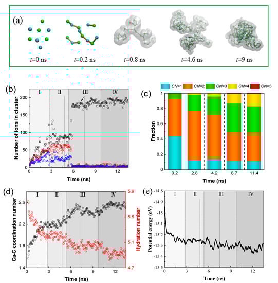 The evolution of the simulation process can be divided into four stages: PNCs spontaneous growth, PNCs solubility equilibrium, aggregation of PNCs inducing nucleation, and the postnucleation stage. In the PNCs spontaneous growth stage, short chains grow to larger PNCs, and the number of ions in the PNCs increases (Figure 2b). The proportion for CN (coordination number) = 1 of Ca-C pairs decreased from 0.44 to 0.12 at t = 2.8 ns (Figure 2c), while the portion for CN = 2 increased to 0.64 implying that the chain-like PNCs dominantly exist in the aqueous solution and they had not yet evolved into ACC with the higher coordination number. In addition, the average Ca-C coordination number in PNCs increased from 1.57 to 2.2. Correspondingly, the hydration number decreased from 5.75 to 5.23 (Figure 2d). As a result, the stable PNCs with the lower potential energy (Figure 2e) were obtained, which suggests that the growth of PNCs was spontaneous [26]. It is noted that the number of ions in PNCs remarkably fluctuated at 2.8 ns (Figure 2b) because of the transient contact and the separation of PNCs. Subsequently in the PNCs solubility equilibrium, due to the reduction of free ions or ion pairs in the PNCs growth stage, PNCs growth terminated and they were stable in the solution. Therefore, the number of ions in PNCs, coordination number, hydration number, and potential energy (Figure 2b,d,e) were almost constant, illustrating that the structures and thermodynamic properties of PNCs maintained unchanged.