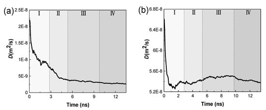 According to the Stokes-Einstein relation, the self-diffusion coefficient (D) is obtained by Equation (1) [33].