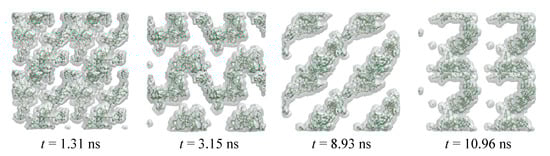 The growth and aggregation of PNCs for 0.48, 0.72, 1.2, and 1.44 mol/L CaCO3 solutions are also simulated to reveal the influence of concentration (Figures S2–S5). For the concentrations of 0.48 and 0.72 mol/L, the evolution of PNCs is similar to that of 0.96 mol/L. While for higher concentrations of 1.2 and 1.44 mol/L, it is worth noting that the evolution of CaCO3 clusters is highly similar to the phase separation via a spinodal decomposition (Figure 4) [16]. At the beginning of the reaction, ions are basically evenly distributed in the solution (Figure 4, t = 1.31 ns). Then, the characteristic channel-like bicontinuous pattern forms (Figure 4, t = 3.15–10.96 ns), while PNCs and nuclei in the nucleation are surrounded by the solvent at low CaCO3 concentrations (Figure 2a) [16]. The thermodynamic and kinetic properties of these structures also change continuously (Figures S4 and S5 in Supplementary Materials), which is in agreement with the notion that no energy barrier needs to be overcome for the spinodal decomposition [16,36]. Consistent with the nucleation, the spinodal decomposition is achieved via continuous dissociation and re-aggregation of the nanoscopic liquid phase in the phase separation.