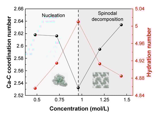Ca-C coordination number and hydration number of aggregates for various CaCO3 concentrations at 360 K. There are two phase-separation pathways: nucleation and spinodal decomposition. The evolution of PNCs at 0.96 mol/L belongs to the nucleation zone. The dotted line is defined as the boundary for two pathways.