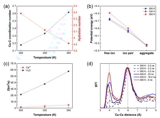 Free ions and ion pairs have higher potential energy and the aggregate has lower potential energy at the same temperature (Figure 6b). The potential energy of ions and ion pairs increases at the higher temperature, indicating that ions and ion pairs are much easier to associate [39]. In comparison, the potential energy of aggregate slightly reduces, suggesting its more stable structure at the higher temperature. Water molecules have a larger diffusion coefficient in aqueous solutions than Ca2+ in PNCs, in addition, the diffusion coefficient of water and Ca2+ in PNCs increases with the temperature, which indicates that a high temperature promotes the movement of ions (Figure 6c).