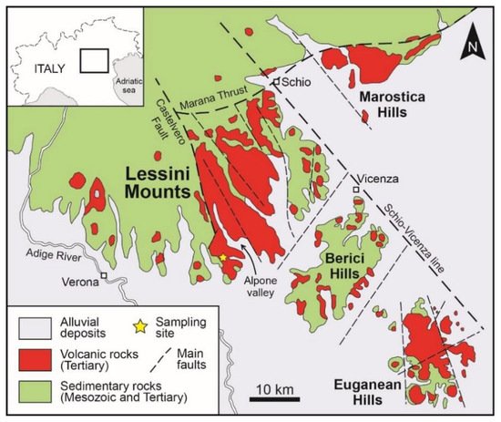 Simplified geological map of the Veneto Volcanic Province (modified from de Vecchi et al. [20]) showing the Lessini Mounts and the locations of the sampling site.