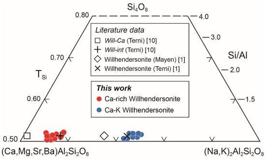 The Ca-K crystals (blue circles in Figure 4), on the other hand, are characterized by comparable quantities of K and Ca and, consequently, are distributed in the central sector of the ternary diagram of Figure 4. Their composition comprises the San Venanzo samples [1] but extends towards richer terms in K, defining greater chemical variability in extra-framework cation content.
