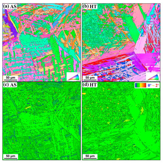 - The grain structure was similar before and after heat treatment; however, higher internal stress was induced in the heat-treated sample.