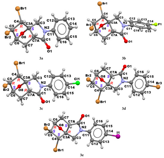 The crystal structures of 3a–e were determined by single crystal X-ray diffraction and are shown in Figure 1 along with the atomic numbering schemes. In contrast to 3a–c, both compounds 3d and 3e crystallize with two molecules in the asymmetric unit, of which only one is illustrated in Figure 1. An important feature of the compounds is the presence of the 3aS,4R,5R,6S,7aR and 3aR,4S,5S,6R,7aS stereogenic carbon centers in 3a–c and 3d,e, respectively (Figure 1). The different configurations seem to be driven by intermolecular interactions in the bromination of 2a–c into 3a–c. The para-halogen substituents have a remarkable effect on the < C1−N2−C11−C16 (for 3a–c) dihedral angles (°): 25.7 (−H), −46.2 (−F), 15.9 (−Cl), −19.1 (−Br), and −19.3 (−I), i.e., aryl and pyrrolidone rings are not co-planar (Figure 1). Moreover, there is no trend between the dihedral angles and the electron-withdrawing character of the substituents.