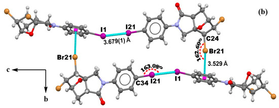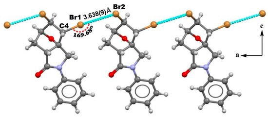 In the crystal of 3a, the molecules are interacting through Br⋯Br type II [3,44,45,46] of halogen bonding to form a 1D supramolecular chain along the b-axis [47], depicted in Figure 2. The Br(1)⋯Br(2) distance (3.638 Å) is shorter than twice the sum of the Bondi’s van der Waals radii of the interacting atoms (Br + Br = 1.85 + 1.85 = 3.70 Å) [48], and the < C(4)−Br(1)⋯Br(2) angle is 169.68°.