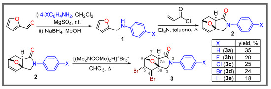 Next, the reaction of 2-(4-substituted phenyl)-2,3,7,7a-tetrahydro-3a,6-epoxyisoindol-1(6H)-ones (2a−e) with [(Me2NCOMe)2H]Br3 in dry chloroform under reflux leads to the corresponding 4,5-dibromo-2-(4-substituted phenyl)hexahydro-3a,6-epoxy-isoindol-1(4H)-ones (3a−e) in yields of 18−35% (Scheme 1).