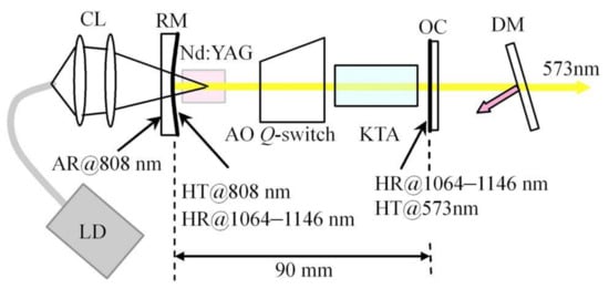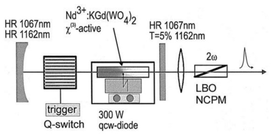 In 1985, the first self-Raman conversion was observed by Andryunas et al. [85] in Nd:KGW and Nd:KYW crystals, and output energy of 11 mJ was obtained with conversion efficiency of 6.14%. In 1999, the first PQS Nd:KGW self-Raman laser at 1181 nm was realized by Grabtchikov et al. [86], corresponding to output power of 4.8 mW and conversion efficiency of 0.7%, respectively. In 2000, the first acousto-optic Q-switched Nd:KGW self-Raman laser at 1162 nm was achieved by Findeisen et al. [12] with maximum pulse energy of 0.1 mJ. Later, Raman radiation was converted into the yellow laser at 581 nm by the external frequency-doubling technology with the LiB3O5 crystal, and the schematic diagram is displayed in Figure 3.