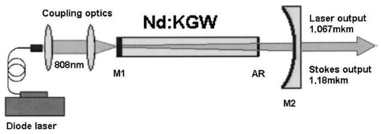 - Lisinetskii, V.; Grabtchikov, A.; Demidovich, A.; Burakevich, V.; Orlovich, V.; Titov, A. Nd:KGW/KGW crystal: Efficient medium for continuous-wave intracavity Raman generation. Appl. Phys. B 2007, 88, 499–501. [Google Scholar] [CrossRef]
