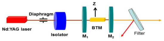 BTM crystallized in a monoclinic system with space group P21 [115]. In 2012, Yu et al. confirmed that the BTM crystal has a wide transmission band (0.4–5 μm), large nonlinear coefficient (d31 = 9.88 pm/V) and high optical damage threshold (544 MW/cm2), flexible phase-matching, and high chemical, and mechanical stabilities [116]. Its strongest Raman shift is 915.2 cm−1 with line width of ~4.4 cm−1 [6]. In 2013, the BTM crystal was employed as self-frequency-doubled Raman crystal to generate the yellow laser at 589 nm, as illustrated in Figure 10 [6]. Maximum pulse energy of 5.6 mJ was achieved at a pump pulse energy of 48 mJ, corresponding to optical-to-optical conversion efficiency of 11.7%.