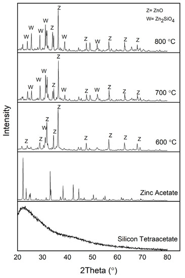 To study the crystalline substances present, the XRD test has been carried on the samples. Figure 1 shows the XRD finding of silicon tetraacetate, Si source for the samples. The broad spectrum and absence of peaks indicates that the silicon tetraacetate is in amorphous state. Figure 1 also shows the XRD peak of zinc acetate which acts as the Zn source for the samples. The peaks available proposes the existence of ZnO crystals in zinc acetate. Figure 1 also present ZnO/Zn2SiO4 samples spectrum which undergoes calcination process with different temperatures; 600 °C, 700 °C, and 800 °C for 3 h. As can be seen from the graph, the pattern from 600 °C calcination temperature exhibits a handful of sharp peaks which suggests the crystallinity of the ZnO peaks which presents the existence of ZnO element in the samples. This corresponds with the findings from the previous study [25].