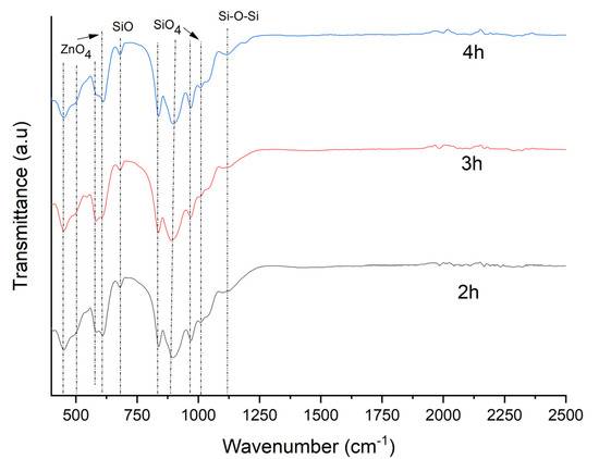 To study the functional group and the phase composition of the ZnO/Zn2SiO4 samples after the calcination process, FT-IR spectroscopy was used. Figure 3 and Figure 4 below show the spectra for the functional group and phase composition of the undoped and Eu3+ doped ZnO/Zn2SiO4 based composites respectively, which undergo different calcination temperatures which are 600, 700, and 800 °C for 3 h. The main peaks of the compounds in the spectra fall in the frequency range of 400–2500 cm−1. Essentially, both figures show the same pattern where, the spectrum display absorption peaks at 462, 500, 580, 620, 700, 802, 884, 989, 1002, and 1100 cm−1. The absorption peak at a wavenumber of 462, 500, and 580 cm−1 indicated the symmetric stretching vibration of the ZnO4 group [21,38,41,45]. Absorption peaks present at 620 and 700 cm−1 ascribed to the ZnO4 asymmetric stretching and SiO torsional vibrations whereas peaks at 812 and 884 cm−1 were assigned to the SiO4 symmetric stretching vibration [21,38,41,42,45,46]. The absorption peak around 989 cm−1 was assigned to the SiO4 asymmetric stretching vibration [15,45,47]. The existence of the vibrations of SiO4 and ZnO4 groups being evidence of the formation of the Zn2SiO4 phase [47,48,49]. The vibrational band observed at 1110 cm−1 ascribed to the Si-O-Si asymmetric stretching vibrations [15,20]. From the Figure 3 and Figure 4, it is found that the increment in the absorption peak intensity at 580 cm−1 which implied the enhancement of ZnO4 group unit by replacing the Si atoms [48]. Next, from the same figures, the dropping in the peak intensity at 620 and 1110 cm−1 can be seen which indicates the decrement of the asymmetrical stretching of ZnO4 and Si-O-Si due to the breaking of ZnO4 and Si-O-Si bonds during the formation of Zn2SiO4 [49]. Table 1 further simplified the absorption band and the corresponding assignment band of the ZnO/Zn2SiO4 composites. The absence of the peaks in the range of 2000–2500 cm−1 in the spectrum indicates that there are no C-O mode and C=H stretching mode of organic sources [29]. With the increase in the calcination temperature, the spectrum shifts slightly to the lower wavelength in the vibrational bands which favors ZnO/Zn2SiO4 composites crystallization and formation [45]. The addition of Eu3+ in the sample may not affect much to the pattern, as a similar pattern can be seen for both figures.