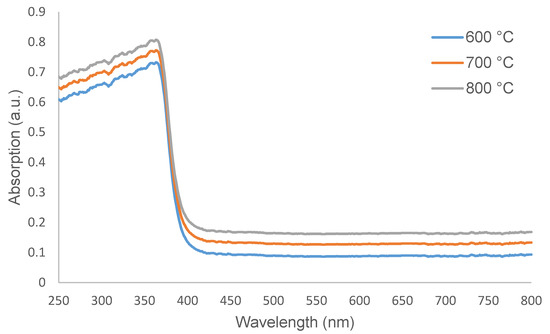 The effects of calcination temperatures on the optical properties, specifically the light absorption characteristic of ZnO/Zn2SiO4 samples has been studied by undergoing the Ultraviolet-visible spectroscopy (UV-vis) in the UV-visible range of 250–800 nm. The below figures show the absorption spectrum of pure and Eu3+ doped ZnO/Zn2SiO4 based composites undergo different calcination temperatures, which are 600 °C, 700 °C, and 800 °C for 3 h. Figure 6 shows the absorption spectra of undoped ZnO/Zn2SiO4 with different calcination temperatures for 3 h. From the graph, it is observed that undoped ZnO/Zn2SiO4 has an absorption band of below 400 nm with higher calcination temperature contributed to higher absorption intensity. This happened due to the scattering of Zn2SiO4 crystals in the samples [53,54]. The absorption bands displayed the red-shift pattern due to the process of crystallization during the calcination process. Dropping of absorption edge also can be seen around 370 nm, which due to the possibility of ZnO structure collapse thus formed the Zn2SiO4 structure [54]. By observing Figure 7, the absorption spectrum of Eu3+ doped ZnO/Zn2SiO4 shows quite a similar pattern to those of undoped samples, with an absorption band of below 400 nm. The absorption spectrum of the doped ZnO/Zn2SiO4 shows that the absorption band is having red-shift as the calcination temperature increased, due to the enhancement of crystallization in the samples which also show that the absorption edge has been enhanced. The UV-vis spectrum of Eu3+ doped ZnO/Zn2SiO4 also show the pattern of higher calcination temperature affect to higher absorption intensity, due to the scattering of Zn2SiO4 crystals in the samples while, the dropping of absorption edge can be seen at around 375 nm, thanks to the reason of ZnO structure collapse which formed the Zn2SiO4 structure, as associated with XRD findings.