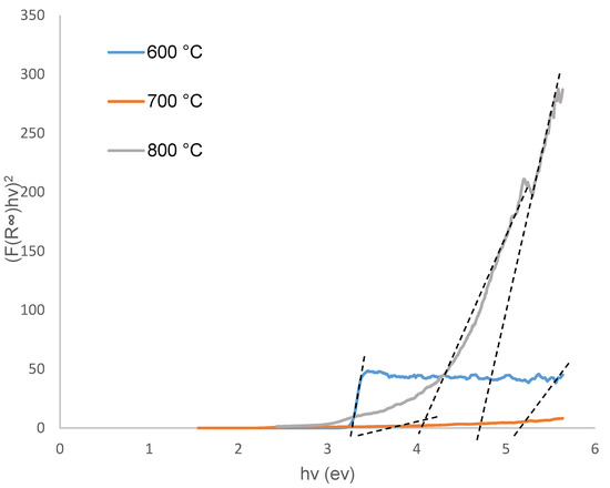 Plot of (F(R∞)hν)2 against hν of ZnO/Zn2SiO4 composites calcined at different temperatures (°C) for 3 h.