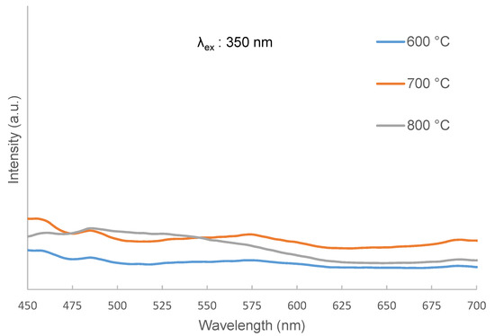 PL analysis was done to study and understand the photoluminescence properties of undoped and Eu3+ doped ZnO/Zn2SiO4 composite samples. The measured emission spectra of the ZnO/Zn2SiO4 samples are between 450 and 700 nm. Figure 10 shows the emission spectra of undoped ZnO/Zn2SiO4 based composites excited under 350 nm while Figure 11 shows Eu3+ doped ZnO/Zn2SiO4 samples excited under 400 nm [57]. From Figure 10, several emission peaks can be seen at 460, 485, and 575 nm which are associated with violet-blue, blue, and green regions, respectively. The emission peak at around 460 nm is indicated to the transition of an electron from Zn interstitial to the valence band and from conduction band to oxygen defects in the region of violet-blue and commonly referred to as blue emission while at the emission wavelength of 485 nm, the peak is associated to the zinc interstitials [57,58]. Located within the green region, the emission peak of 575 nm was associated with the transition of electrons between the valence band and conduction band [56]. From the same figures, it is also observed that as the calcination temperature increases from 600 °C to 700 °C, the emission peaks also increases. This is due to the enhancement of the crystal quality in the material [59].