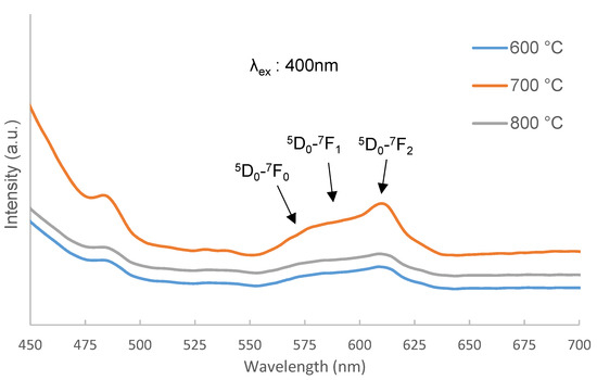 Next, the 5D0→7F0 transition at the emission peak of 578 nm belongs to the 4f-4f transitions, which is principally forbidden according to the standard selection rules of the Judd–Ofelt theory [61]. Hence, the peak should be inexistent or very weak in the PL emission spectrum, however, due to the possibility of the majority of Eu3+ ions occupy the interstitial sites with much lower local symmetry in the ZnO/Zn2SiO4 host, hence affect to the occurrence of 5D0→7F0 transition [62,63]. While the emission peak at 590 nm with the electronic transitions 5D0→7F1 is attributed to the magnetic allowed transitions (∆j = 1) with an insensitive magnetic dipole transition to the environment [21,64,65]. As shown in the figure, the prominent emission peak is found at 615 nm with the electronic transitions 5D0→7F2. This transition is ascribed to the allowed transitions of an electric dipole (∆j = 2) with hypersensitive electric dipole transition to the crystal field environment [21,66]. At 615 nm, the strong emission peak of Eu3+ which is characteristically red emission was attributed to magnetic dipole (MD) transitions. This peak shows that the Eu3+ ions had occupied the non-centrosymmetric site in the Zn2SiO4 crystal lattice [67]. The peak in the emission spectra was also almost similar to the emission peak of the commercial red phosphors (Y2O3:Eu from Nichia Corporation, Japan) which show that the highest emission peak is around 615 nm, which support the emission peak of this work having the highest emission peak at 615 nm [68]. From the graph, it was also shown that the 700 °C samples produced higher emission peaks as compared to 600 °C and 800 °C. This shows that 700 °C was the optimum calcination temperature for the red emission and will emit the brightest red color when excited under the UV lamp.