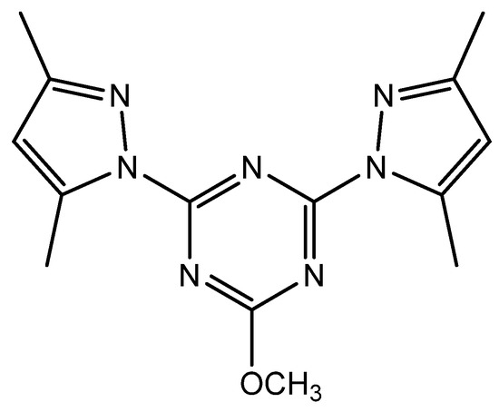 - Soliman, S.M.; Elsilk, S.E.; El-Faham, A. Synthesis, structure and biological activity of zinc(II) pincer complexes with 2,4-bis(3,5-dimethyl-1H-pyrazol-1-yl)-6-methoxy-1,3,5-triazine. Inorg. Chimica Acta 2020, 508, 119627. [Google Scholar] [CrossRef]