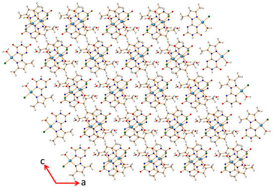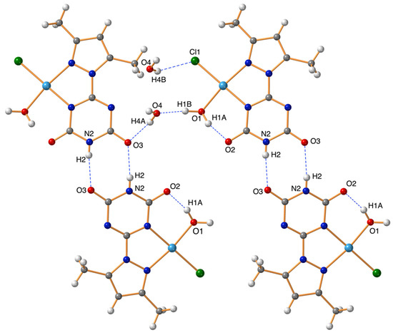 In [Pd(PT)Cl(H2O)]*H2O complex, the Pd(II) is coordinated by a chloride anion, one water molecule as monodentate ligands and two nitrogen atoms from the chelating ligand PT−1 as a mononegative bidentate NN-chelate. The Pd(II) exhibiting slightly distorted square planar coordination geometry (Table 2, Figure 2). The structure of the metal complex is supported by one intramolecular H-bond between the coordinated water molecule (H1A) and the oxygen (O2), forming the organic chelate (PT−1), leading to the six-membered ring (Figure 3). The asymmetric unit also contains water of crystallization. The NH2-group and the oxygen O3 are involved in a pair of hydrogen bonds binding the metal complex with the adjacent molecule at the equivalent position of −x + 1, y, −z + 1.5. The aqua ligand is also hydrogen bonded to the water of crystallization (Figure 3). The water of crystallization forms additional hydrogen bonds with chloride ligand as well as with O6 of the neighboring metal complexes. Additional weak CH⋅⋅⋅O type H-bonds (C6-H6⋅⋅⋅O4 and C8-H8C⋅⋅⋅O4) are supporting the overall packing of the molecules. The hydrogen bonds are summarized in Table 3 and Figure 3. Packing of the Pd(II) complex units stacked along the crystallographic b-axis is shown in Figure 4.