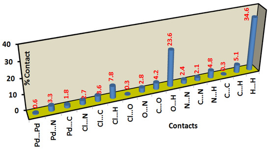 All possible intermolecular interactions and their percentages in the Pd(II) complex.