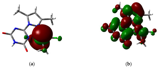 The HOMO (a) and LUMO (b) levels of the studied complex using MPW1PW91 method.