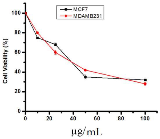 3-(4,5-Dimethylthiazol-2-yl)-2,5-diphenyltetrazolium bromide (MTT) assay was carried out according to the previous report by Abutaha et al. [45]. Briefly, trypsin was added to MDA-MB-231, and MCF-7 cells, and then cells were counted and seeded at 5 × 104 cells/well in the 24-well plate for 24 h. The following day, cells were incubated with different concentrations of the compounds for 48 h with 5% CO2 at 37 °C. After that, 100 µL of MTT (5 mg/mL) (Thermo, USA) was added to each well and left for 2 h. Next, the supernatant was discarded, and 1000 µL of methanol was added, and the formazan was quantified at 595 nm using a microplate reader. Triplicates were used to calculate the cell viability percentage and the IC50 values using OriginPro 8.5 software.