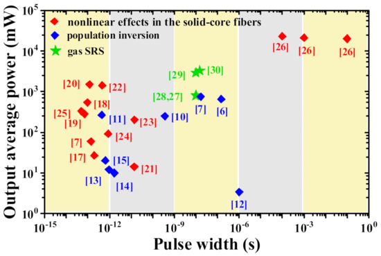 The traditional methods of realizing 1.7 μm pulsed fiber lasers can be mainly classified into two categories. One is based on population inversion to generate 1.7 μm pulsed lasers by using rare-earth-doped fibers, such as thulium-doped fibers [6,7,10,11], thulium–holmium-codoped fibers [12,13], and bismuth-doped fibers [14,15,16]. The other is based on nonlinear effects in solid-core fibers to realize a frequency conversion, such as soliton self-frequency shift [17,18,19,20], four-wave mixing [21,22,23], self-phase modulation [7,24,25], and stimulated Raman scattering (SRS) [26]. Recently, fiber gas Raman lasers (FGRLs) based on hollow-core photonic crystal fibers (HC-PCFs) have opened a new opportunity for 1.7 μm pulsed fiber lasers [27,28,29,30]. The principle of FGRLs is to realize a frequency conversion by gas SRS in HC-PCFs. The output average powers and corresponding pulse widths of reported 1.7 μm pulsed fiber lasers are plotted in Figure 1.