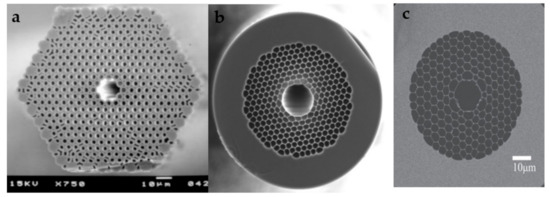 The schematic cross section of HC-PCFs. (a) The first PBG-HCF [31], (b) low-loss PBG-HCF [32], and (c) broadband PBG-HCF [34].