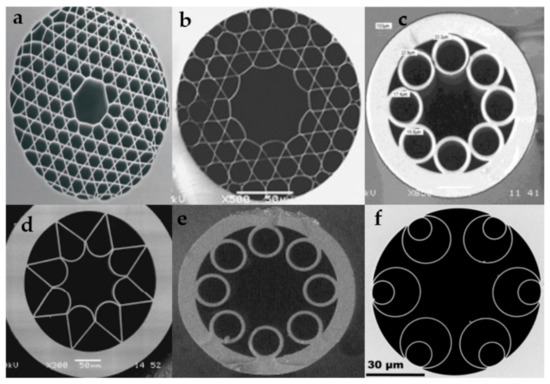 - Bufetov, I.A.; Kosolapov, A.F.; Pryamikov, A.D.; Gladyshev, A.V.; Kolyadin, A.N.; Krylov, A.A.; Yatsenko, Y.P.; Biriukov, A.S. Revolver Hollow Core Optical Fibers. Fibers 2018, 6, 39. [Google Scholar] [CrossRef]