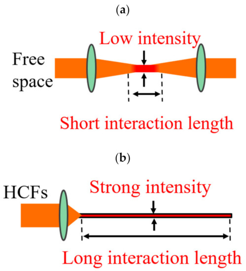 Since gas SRS was first reported in 1963 [54], gas SRS has been considered as a significant method to realize a laser of a new wavelength by frequency conversion. Gas SRS can cover the ultraviolet-to-infrared band [55,56], which is an effective extension of the laser output band. Figure 4a is a simplified schematic diagram of the interaction between lasers and gas in traditional Raman gas lasers. Owing to the diffraction effect of laser transmission in free space and some other factors, the gas SRS in free space has a short interaction length and low intensity, leading to an extremely high Raman threshold. Normally, traditional gas Raman lasers require pump pulsed lasers with megawatt peak power to reach the Raman threshold. Moreover, there would be many Stokes waves generated, so it is difficult to realize efficient conversion of a single Stokes wavelength in traditional gas Raman lasers. These problems limit the applications of traditional gas Raman lasers. However, for FGRLs, gas SRS occurs in HC-PCFs, and a simplified schematic diagram of the interaction between lasers and gas in FGRLs is shown in Figure 4b. HC-PCFs can confine lasers to the small core for long-distance transmission, so an extremely low Raman threshold can be achieved. Furthermore, the output Stokes waves can be controlled by designing the transmission band of HC-PCFs. Thus, HC-PCFs provide an ideal environment for efficient gas SRS, meeting the requirements of strong interaction intensity, a long interaction length, and a controllable Raman gain spectrum at the same time.